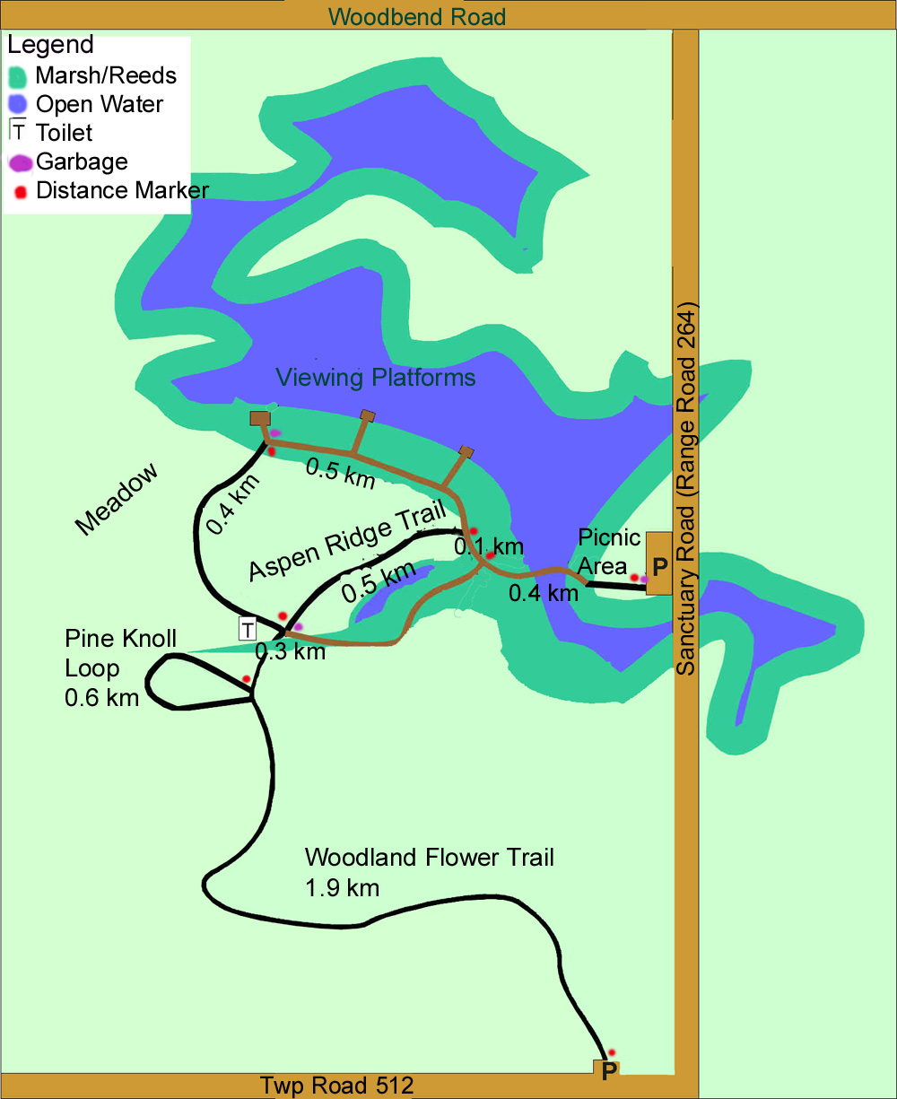 - Aspen Ridge – Follow the boardwalk from the picnic area and veer to the right at the first junction. The Aspen Ridge Trail starts along the boardwalk. As you step off the boardwalk, the earth trail rises up atop a ridge covered by groves of trembling aspen. The leaves of the trembling aspen rustle in the wind but beneath the canopy it is calm and peaceful. As you stroll along, you may see a hare bounding through the dense understory or a chipmunk scurrying across the trail. The canopy begins to open and the trail descends as you come to its end. The boardwalk will take you back to the picnic area or you can look at the map, posted at the trail junction, to see where to go next.